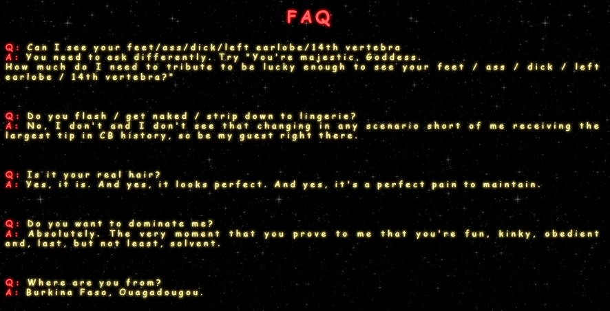 Sigara İçen, Erotik Dans, Metresler, Topuklu, Ayak Fetişi, Naylon, Rol Oyunu, Deri, Lateks, Konuşmalı, Strapon